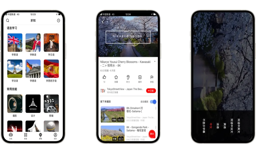 同时也可以在求知界面,学习技能、知识,比如外语、摄影、设计、剪辑、办公、动画、乐器、编程、绘画、建模等
