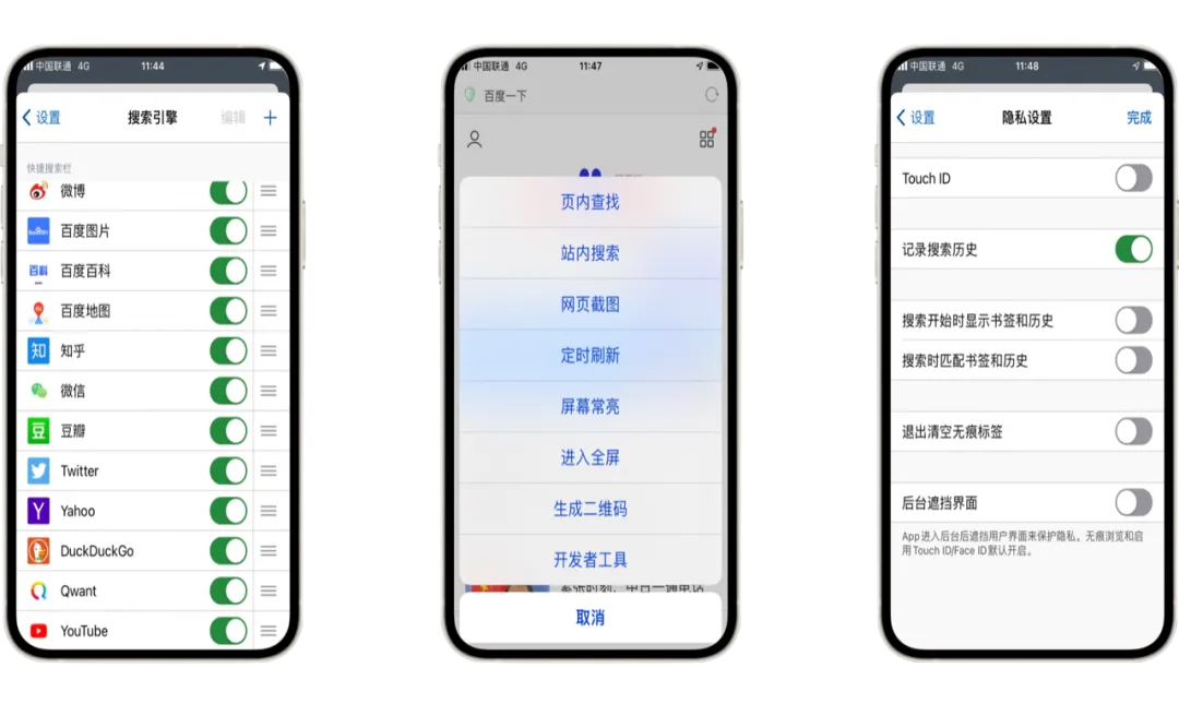 另外浏览器还支持强力广告拦截、二维码生成、定时刷新等功能,支持iCloud同步,在隐私设置方面,支持后台遮挡界面。