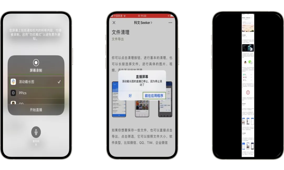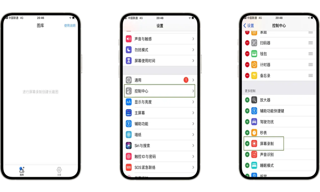 之后将屏幕录制添加到控制中心,在需要截图的界面,调出控制中心,长按录屏按钮,切换到滚动截长图,之后点击开始直播