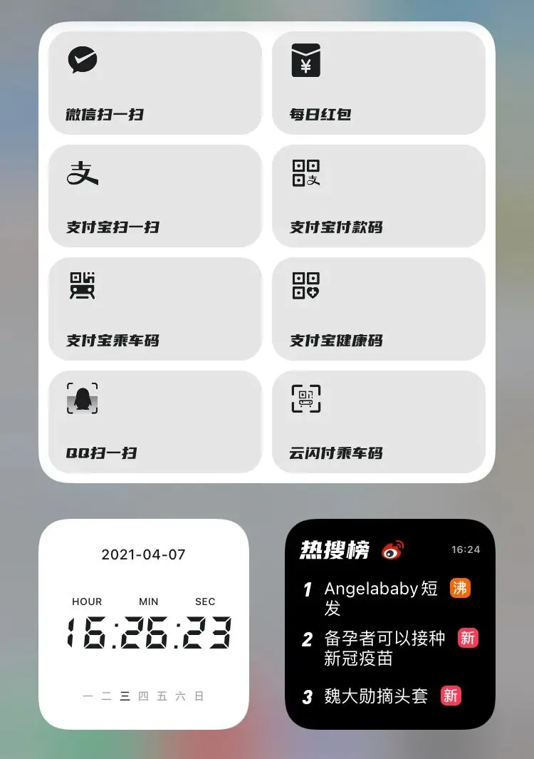 同时,也可以选择快捷小组件,比如可以让你快捷地进行微信、支付宝扫一扫、调出收付款码、调出乘车码、健康码等