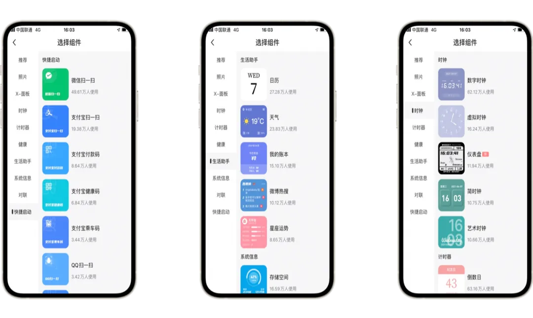同时还有日历、天气、微博热搜、星座、储存空间、流量情况、倒数日、步数、账本等小组件。