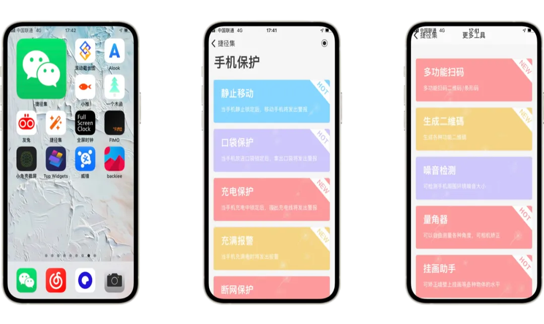 在这个软件里,你可以将软件更改为超大图标、建立隐私相册、测试网速、建立纪念日等,有个比较有趣的功能是手机保护