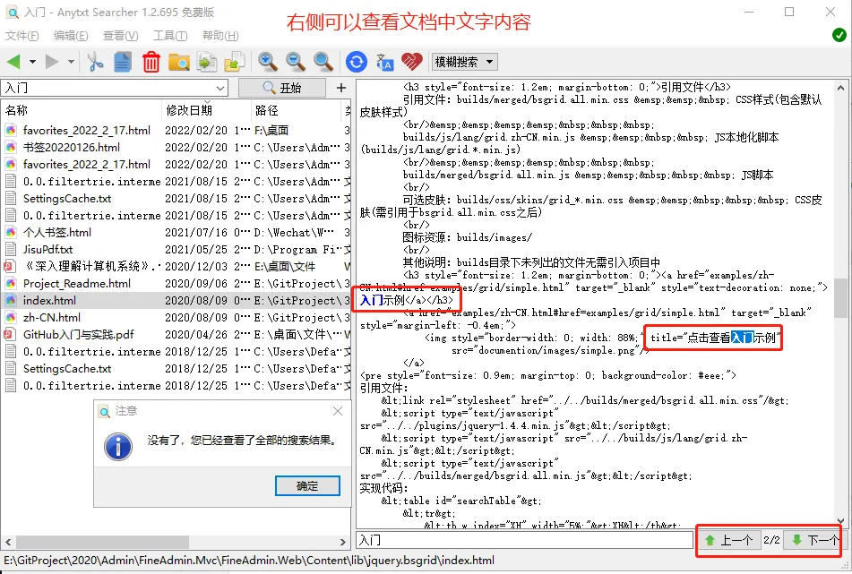搜索界面展示,支持打开文档目录,右侧可以查看文档中的文本内容