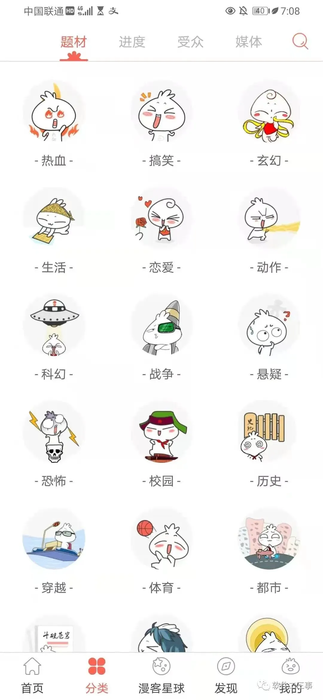 24种漫画题材,热血、搞笑、玄幻、生活、恋爱、动作、科幻、悬疑、恐怖、校园、历史、穿越、后宫、都市、萝莉……