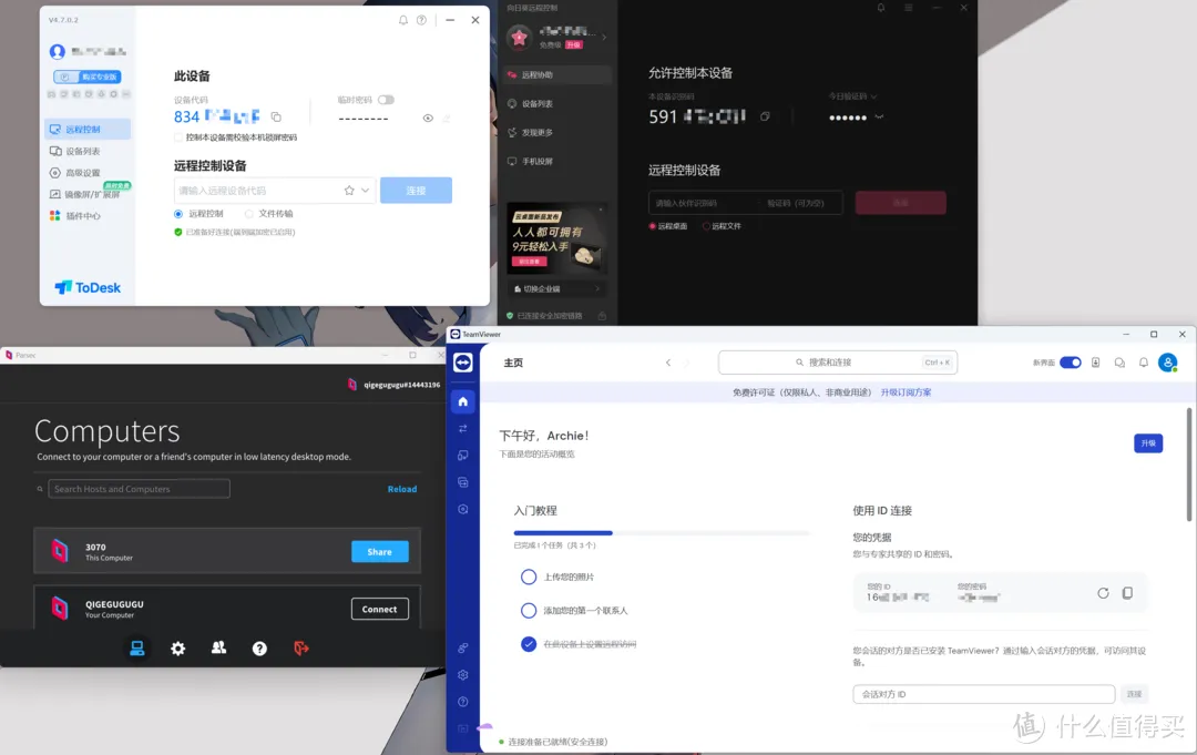 先来看看4款软件的界面主界面,ToDesk、向日葵、TeamViewer比较接近,都是左右布局,Parsec则是上下布局。
