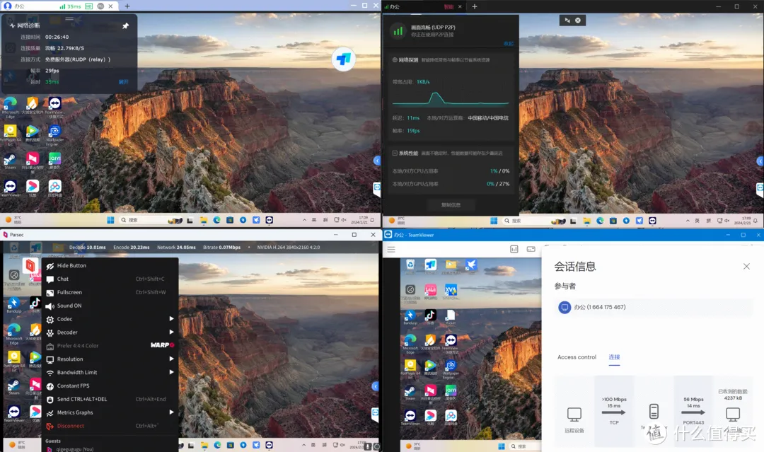 开启远程控制后,在窗口下可以看到4个界面,这里ToDesk、向日葵、TeamViewer依然是比较接近的,Parsec不太一样,功能项非常简单。其中ToDesk和向日葵都有远程监测数据,下拉标签上会显示设备、延迟、帧率等信息。