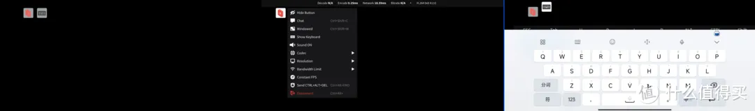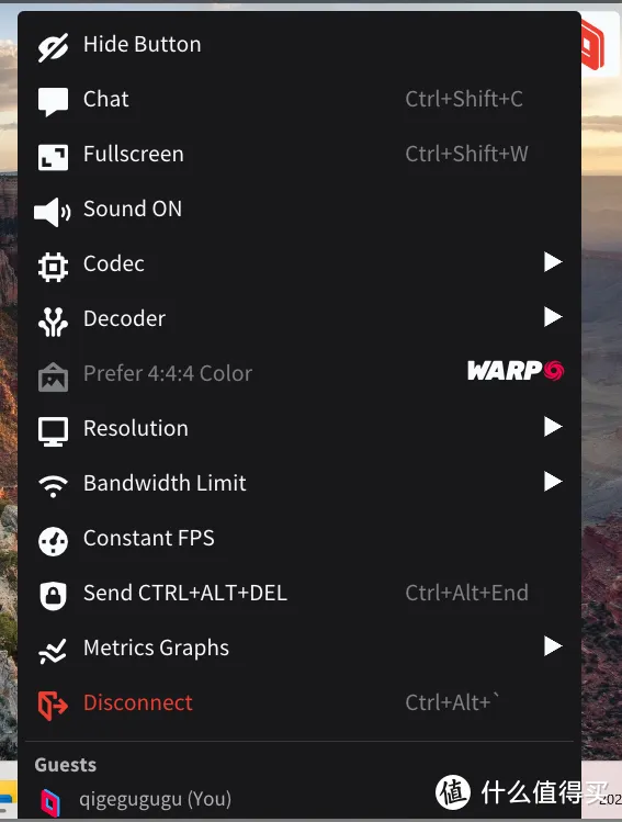 在Parsec中,也是有类似的设置,不过是全英文,看图标其实也比较好懂,可以聊天、全屏、调整声音、分辨率等内容,不过有一说一,Parsec真的很容易断连,在我测试过程中断了2次。