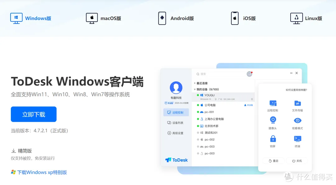进入ToDesk界面就能看到设备列表,可以对设备进行远控、锁定、重启、关机、观看、文件传输和摄像头。