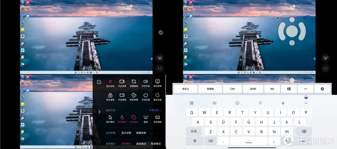 而向日葵和ToDesk类似,默认也是触屏,点击鼠标可以变成指针模式。点击右侧底部的粉色图标就能出现控制界面,一大版面都是,清晰明了。点击键盘就会弹出键盘,上面直接有快捷键,这个设计我挺喜欢的。