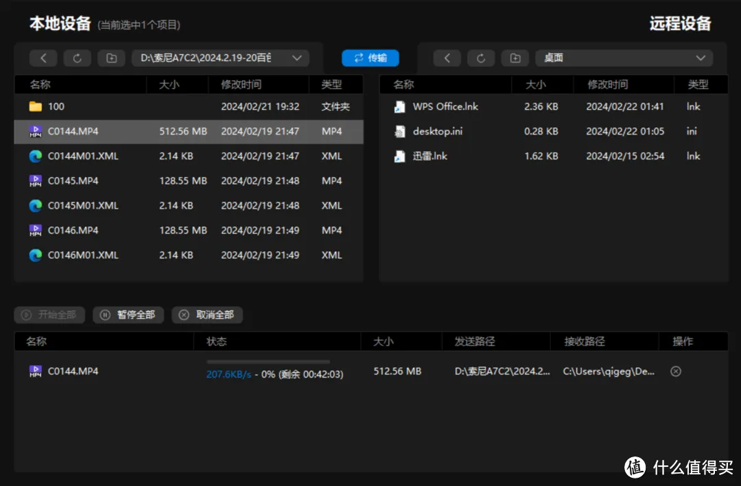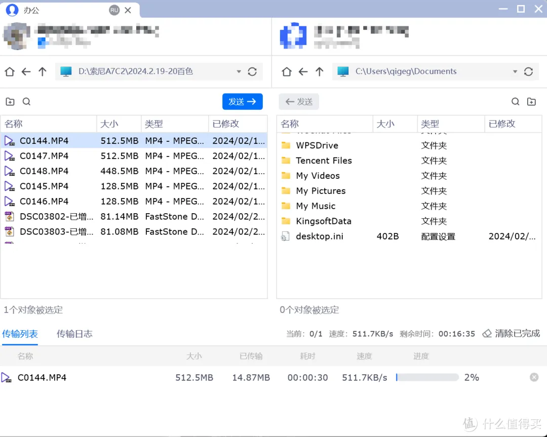 文件传输也是远程控制中比较基础的功能,在这4个软件中,除了Parsec没有,其他都放在比较明显的位置。其中ToDesk和向日葵的设计比较清晰,ToDesk还有个传输日志。如果要传输文件只要找到对应的目录传输即可,按照箭头方向,两边选好目标文件后点击发送就好。