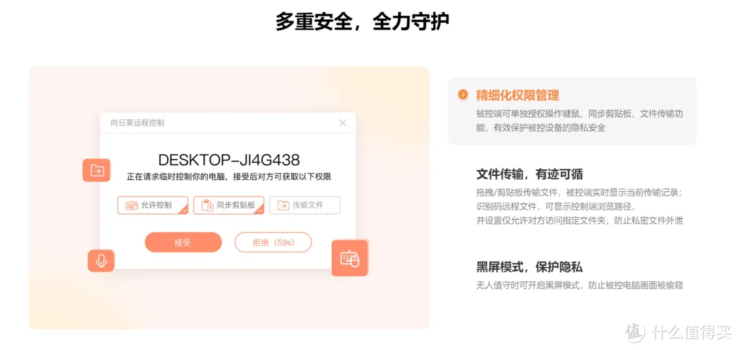 再来看看在安全和隐私保护方面。ToDesk在连接中会有各种安全和权限开启的提醒,还有隐私屏阻挡屏幕被观看,开启金融APP会被黑屏等防护措施,可谓是非常实用且高级。