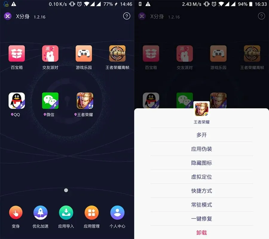支持微信、QQ、王者荣耀、淘宝等社交、游戏、支付类应用双开,多个账号同时在线,免切换。