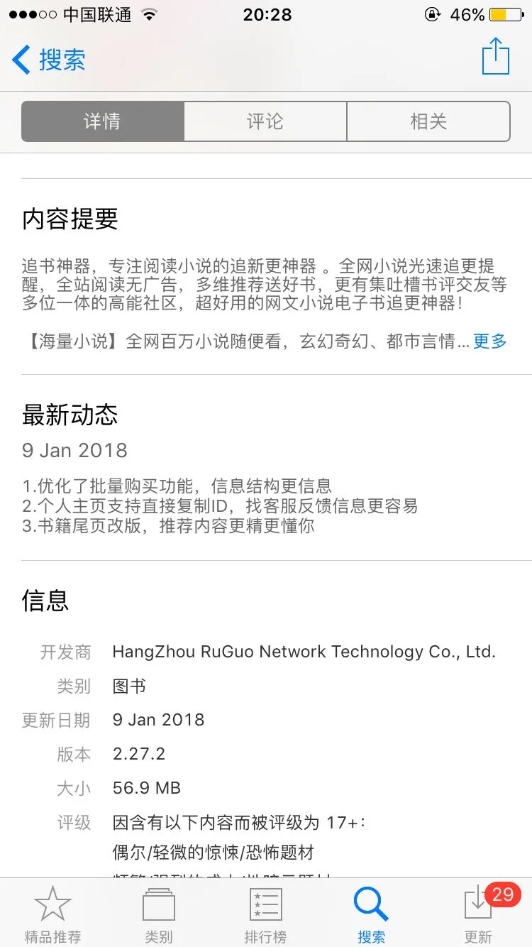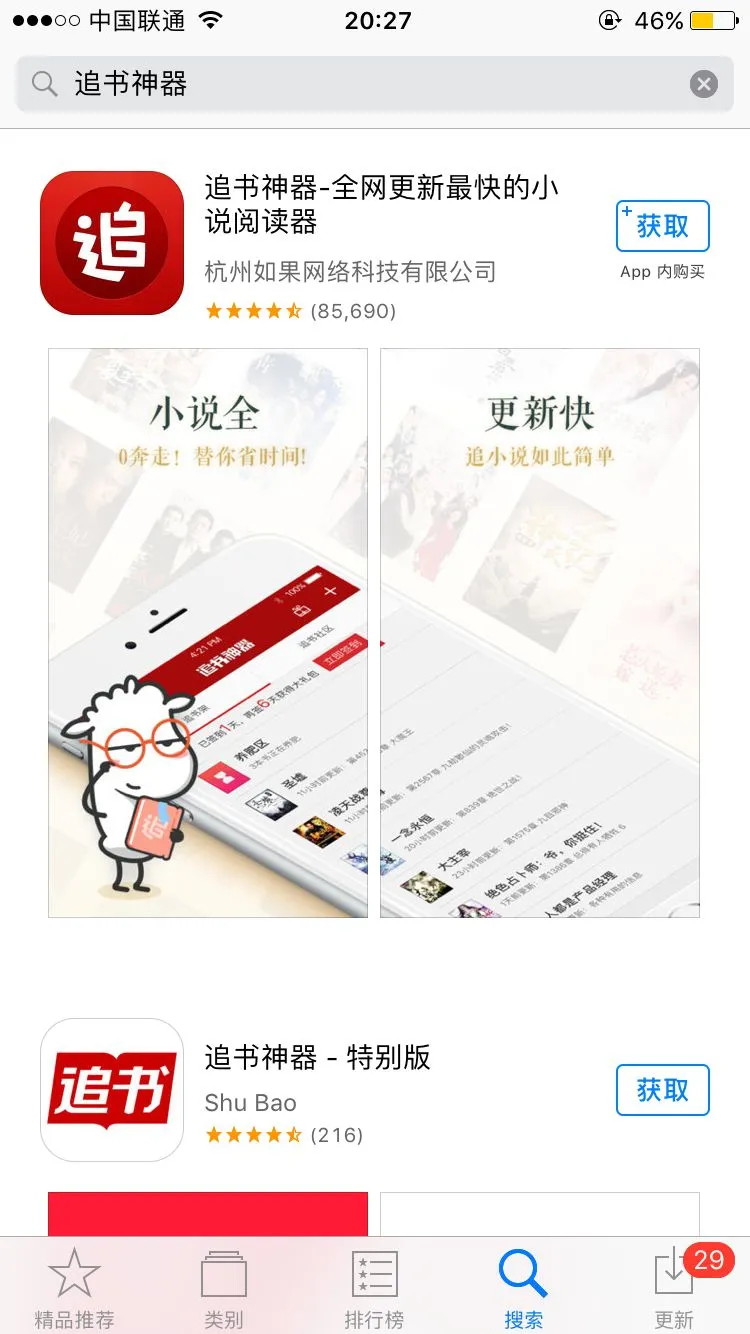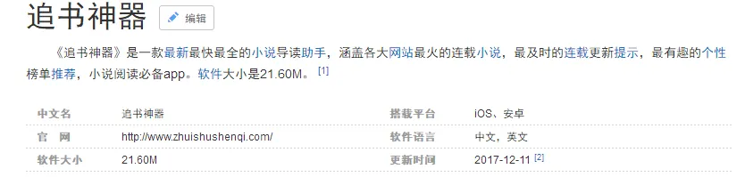 再看一下百度百科对它的介绍。《追书神器》是一款最新最快最全的小说导读助手,涵盖各大网站最火的连载小说,最及时的连载更新提示,最有趣的个性榜单推荐,小说阅读必备app。软件大小是21.60M。评价还是不错的哈