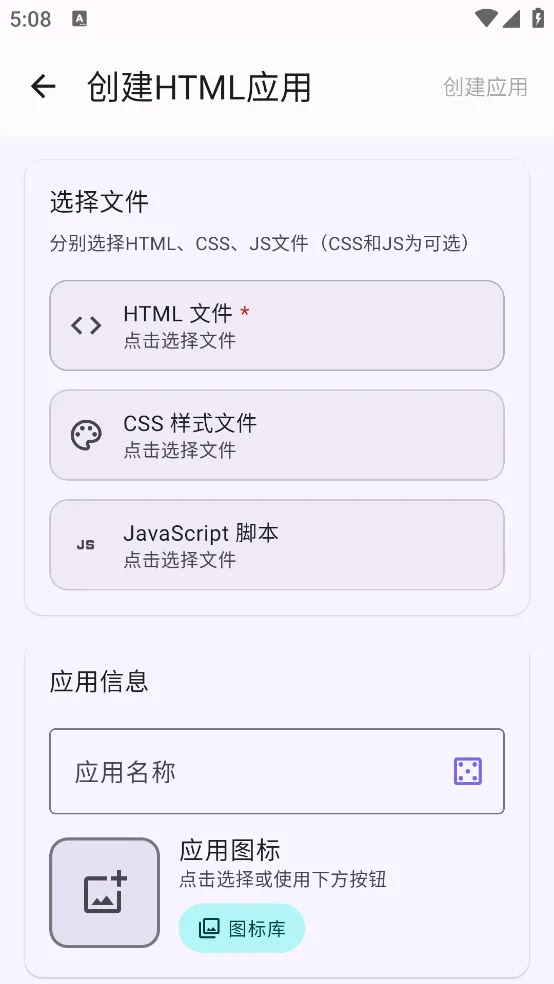 1.创建HTML 应用:可分别上传:HTML 文件、CSS 样式文件和JavaScript 脚本,并填写应用名称和图标
