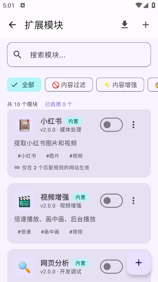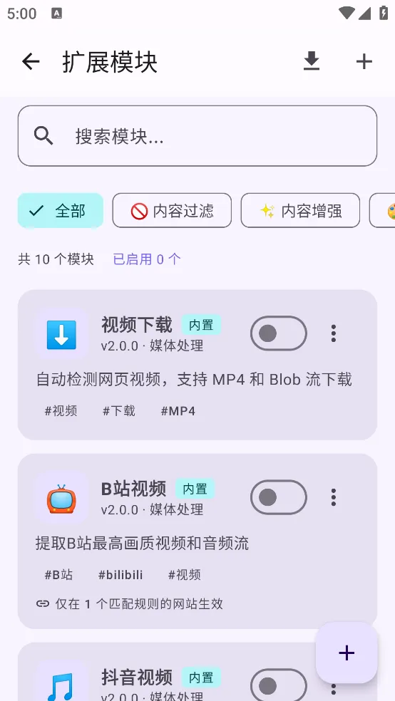 4.扩展模块(内置插件系统):提供 10+ 内置模块,支持“一键下载”、“去水印”等功能