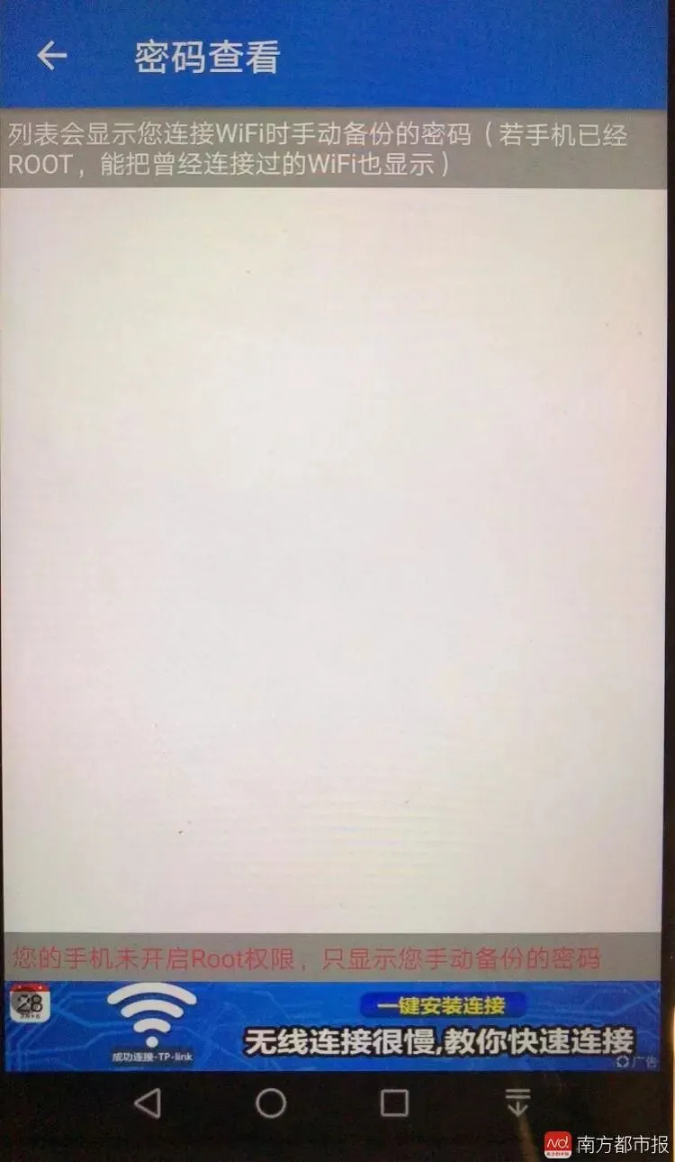 隐私护卫队并不知道自己刚刚输入的密码被储存在了哪里,将会做什么用。接着隐私护卫队用另一部恢复了出厂设置的安卓手机(简称手机2)也下载了“WIFI万能密码钥匙”,并点击打开。