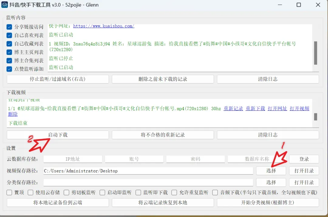 然后我们再打开D音、快手的视频,让软件监听视频。下载前我们首先设置保存路径,再点【启动下载】