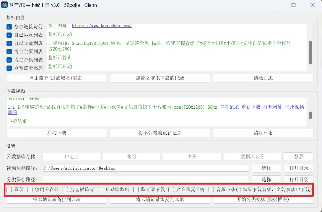 更贴心的是,它还有超多实用小功能可以勾选:剪切板监听、启动即监听、监听即下载、允许重复监听、单独音频下载,根据自己的需求选就行,简直把 “懒人友好” 刻在了骨子里。