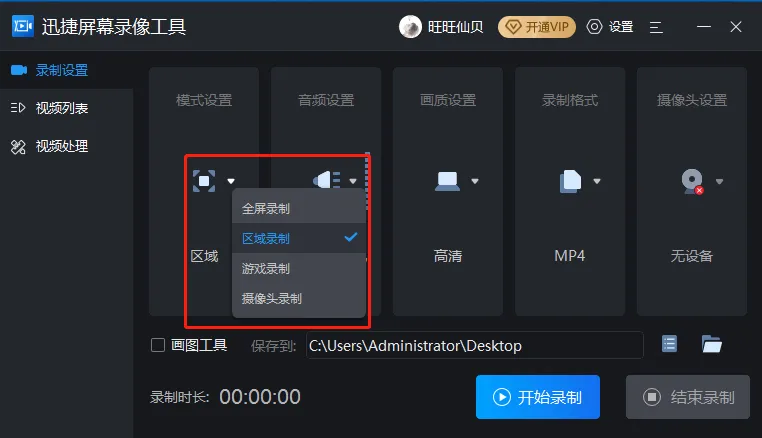 在【模式设置】里有四种录制模式可选:全屏录制、区域录制、游戏录制、摄像头录制。