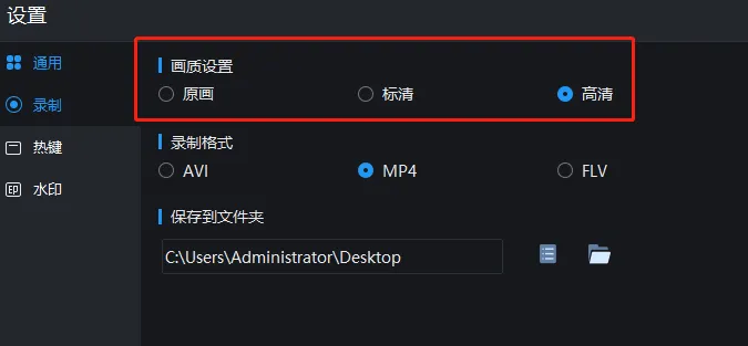 有 3种画质供你选择:原画、标清、高清!高清录制,并有AVI、MP4、FLV三种录制格式可选。
