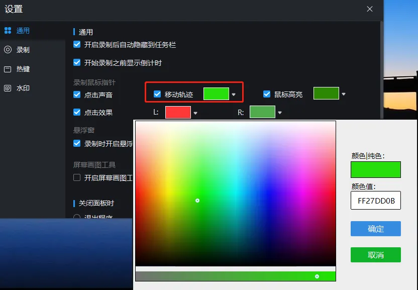 设置起来也非常简单,只要在设置里勾选“移动轨迹”效果,就能实现,并且还支持自定义颜色。除此之外,还支持鼠标点击效果、点击声音、高亮效果。