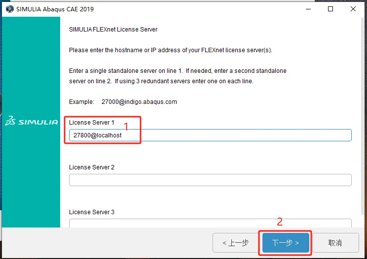 第三十一步:在License Server1处输入【27800@localhost】,点击【下一步】。