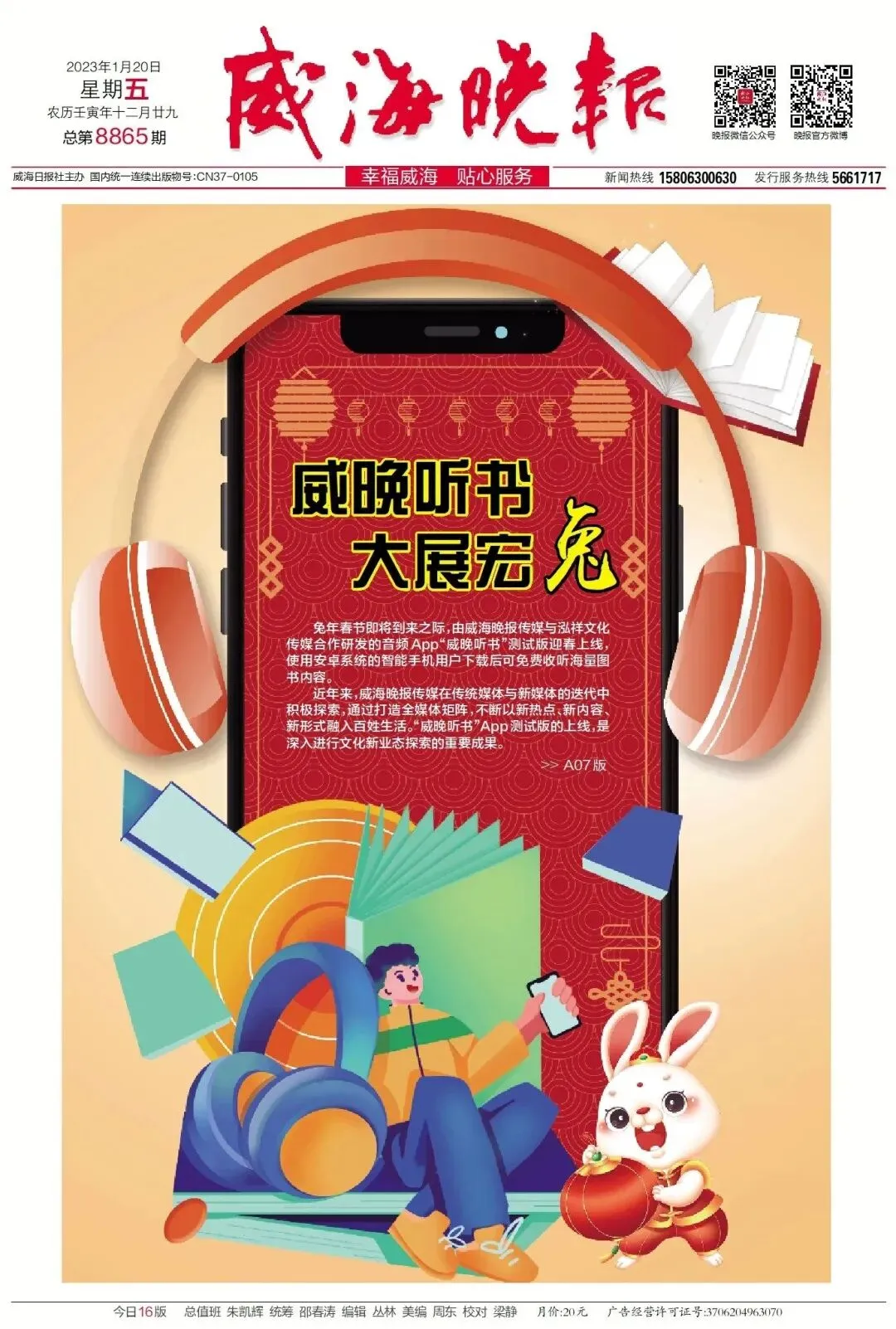 在兔年春节即将到来之际,由威海晚报传媒与泓祥文化传媒合作研发的一款音频App“威晚听书”测试版迎春上线,使用安卓系统的智能手机用户可用浏览器扫描“威晚听书”App二维码下载,随时随地免费收听海量图书内容。
