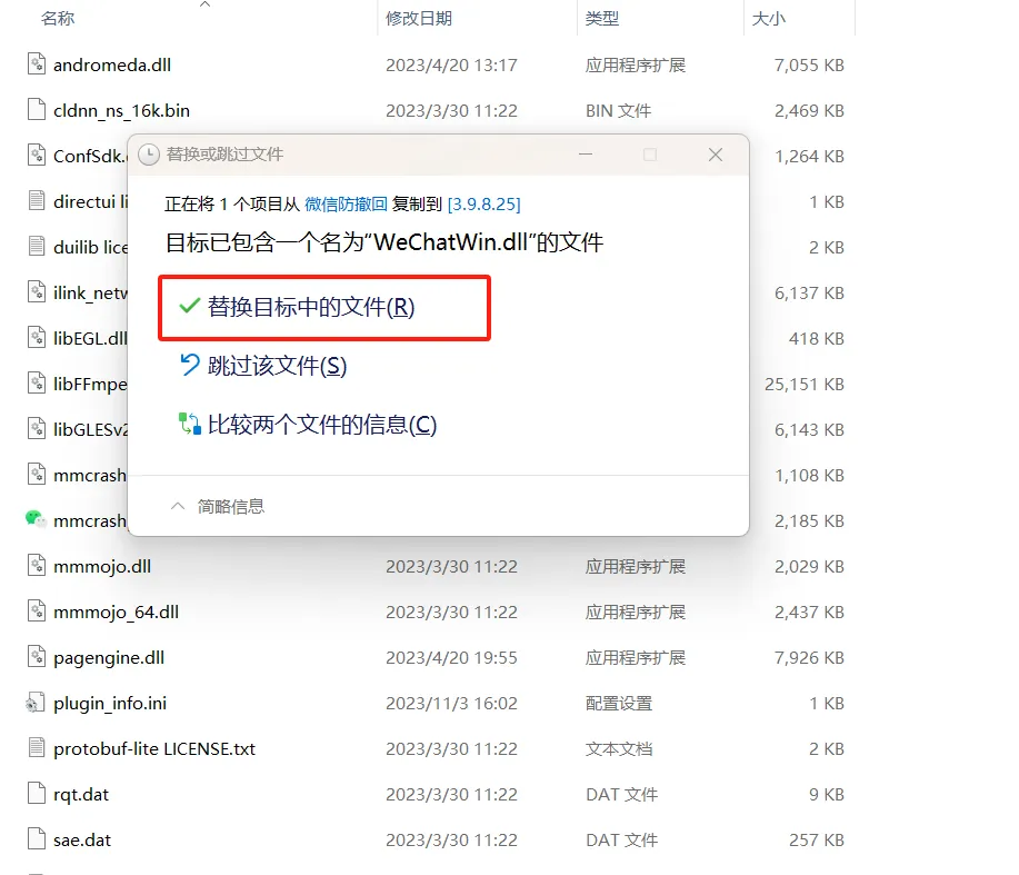 ⑤ 将下载的WeChatWin.dll拖入该文件夹,替换原文件即可。如果提示文件正在被使用,退出微信后重新拖入。