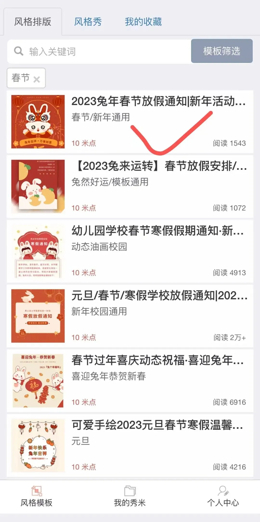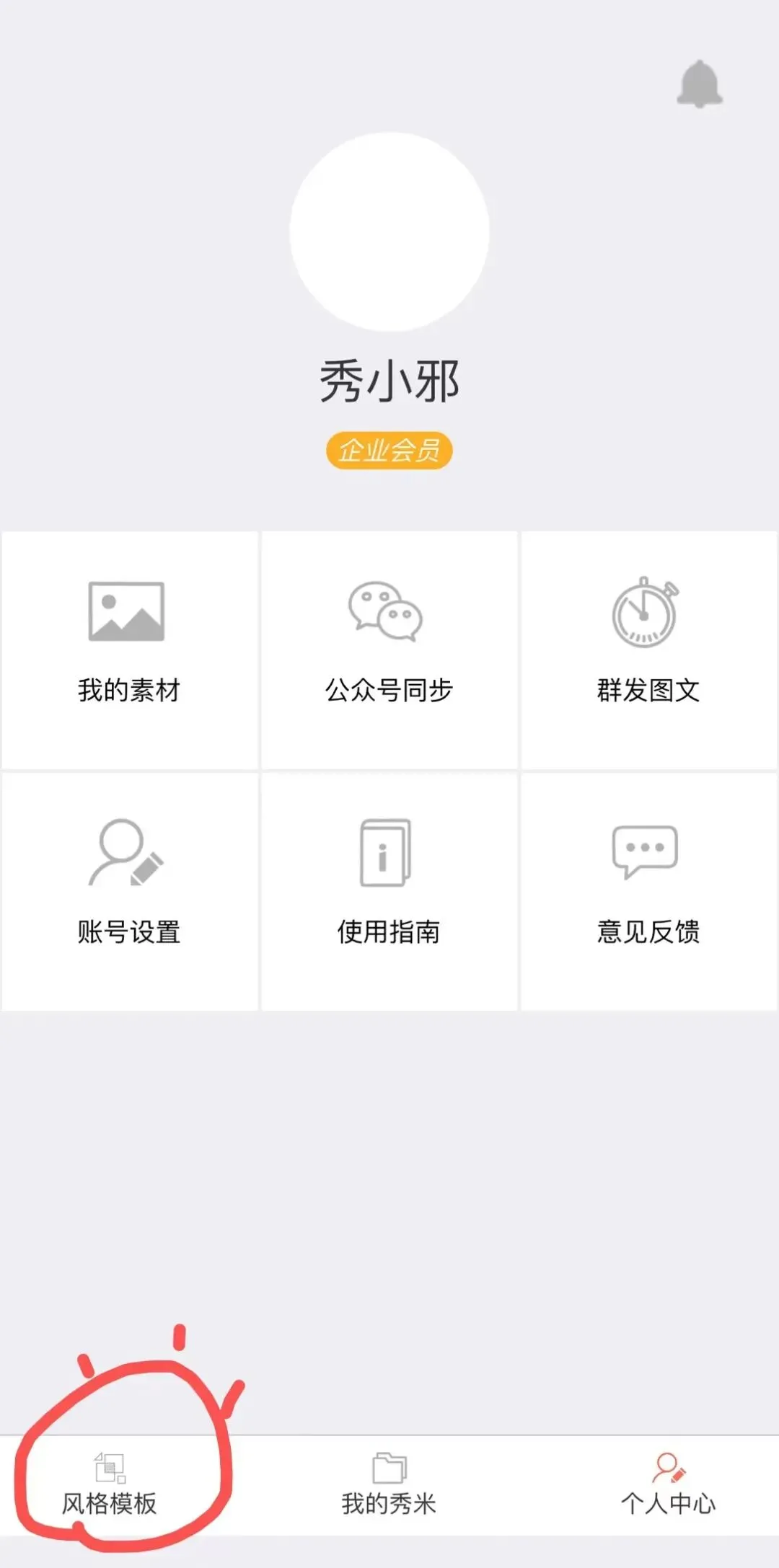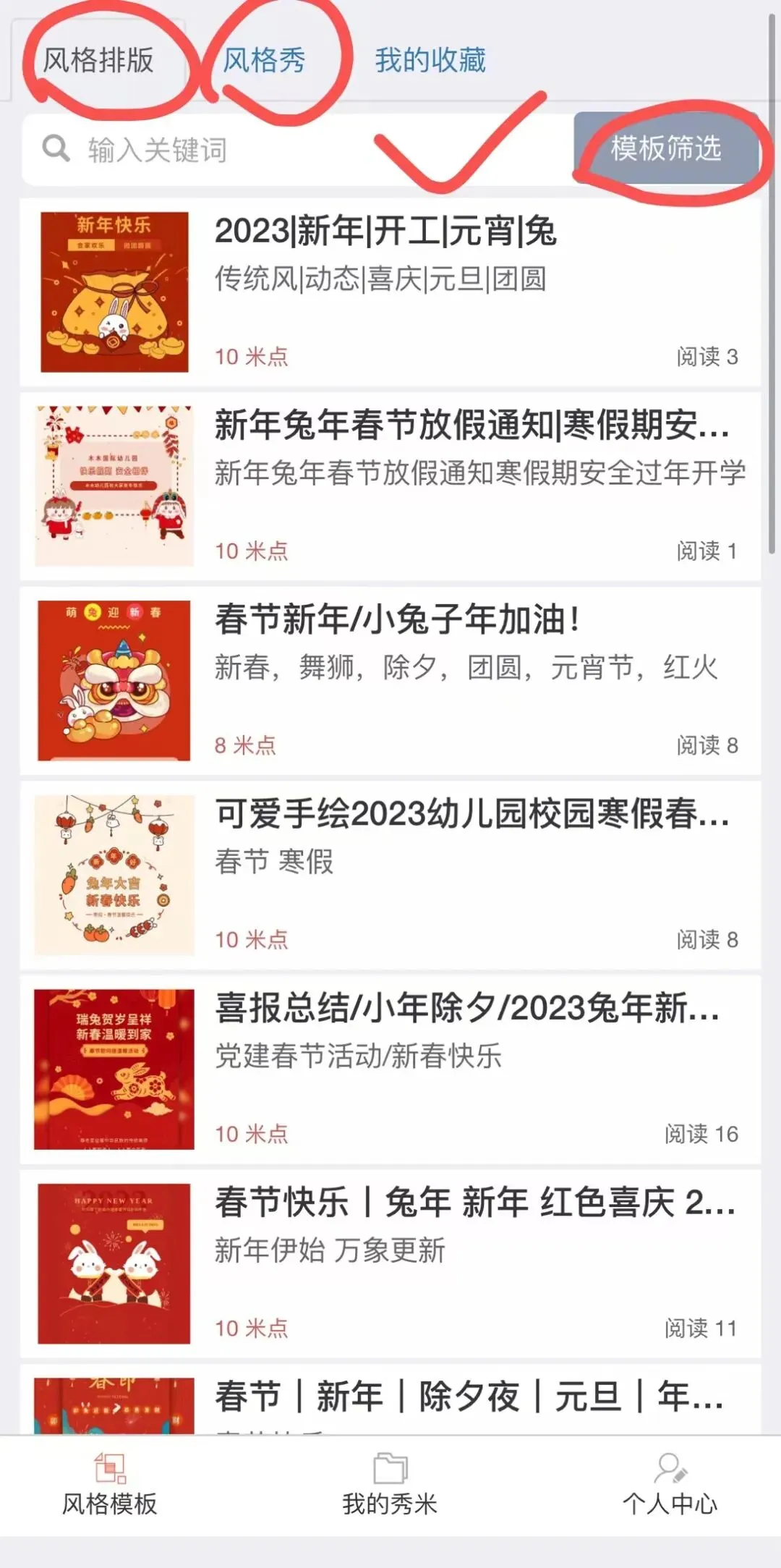 打开秀米APP,点首页底部的“风格模板”进入风格模板选购界面: