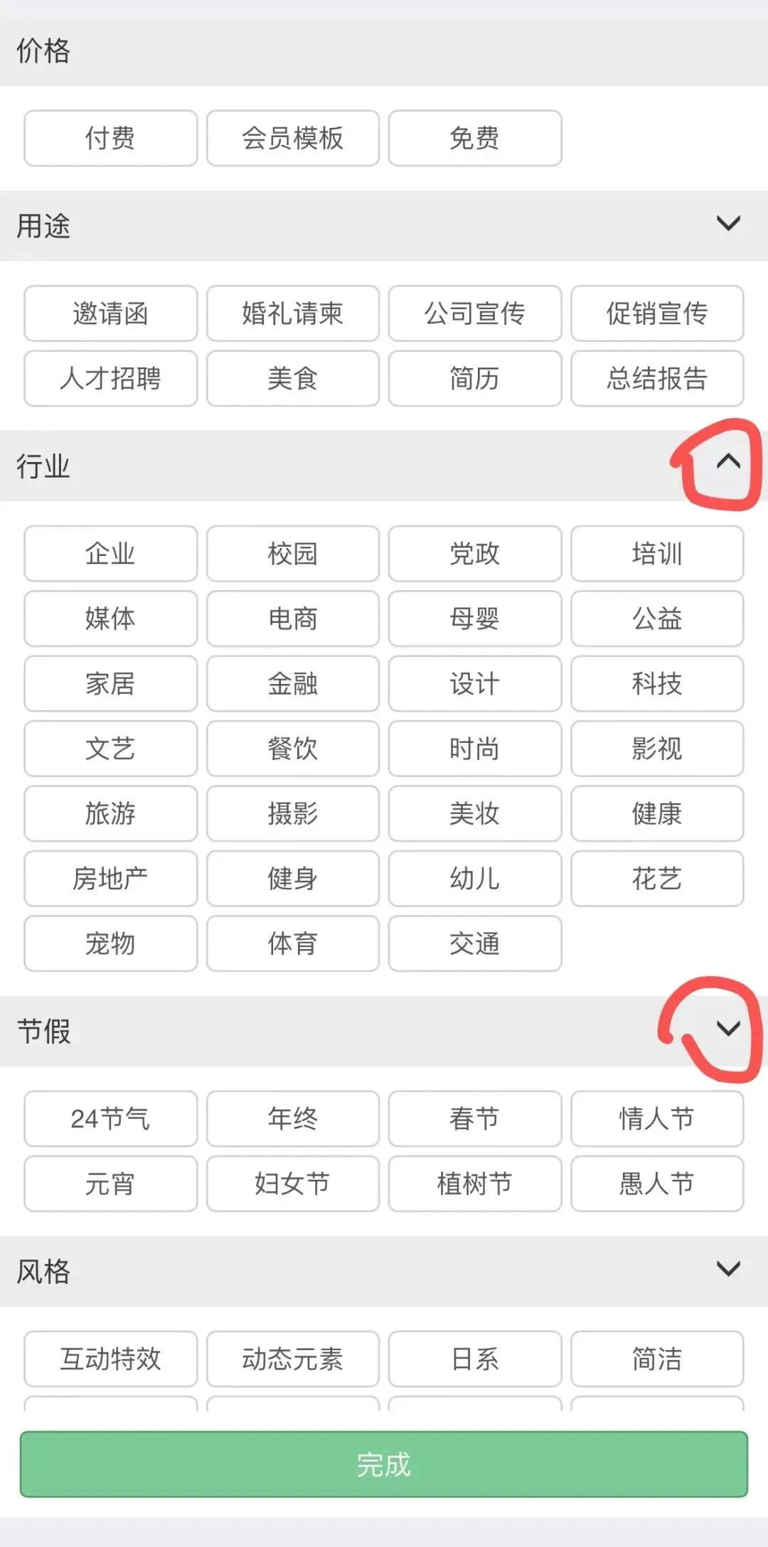 点了“模板筛选”之后,点分类名右侧的小箭头,可以展开收缩标签名,点一下标签,就可以筛选出该标签下的模板: