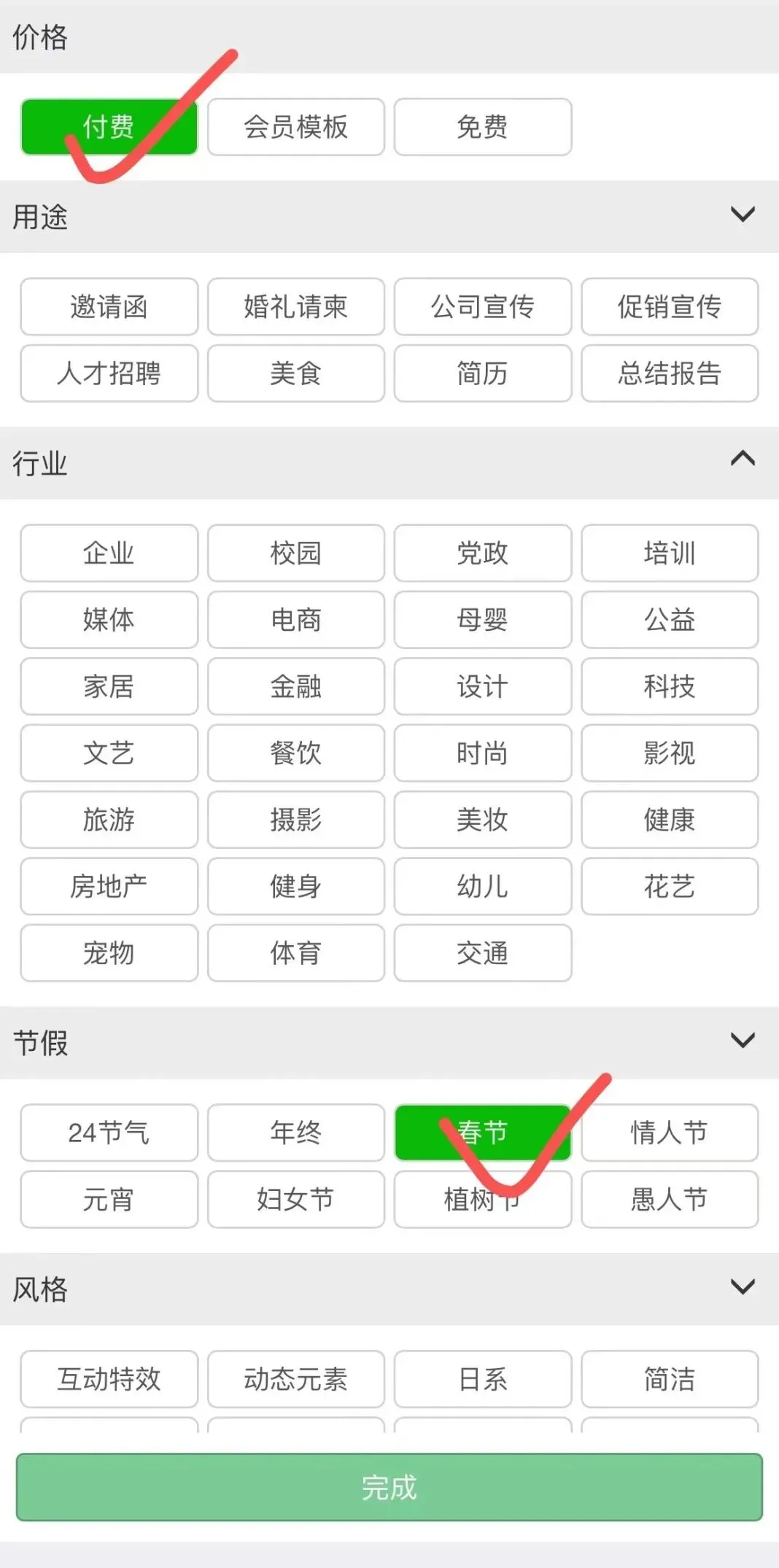 选购界面的顶部有“风格排版”和“风格秀”分类:风格排版指的是图文排版,风格秀指的是H5。
