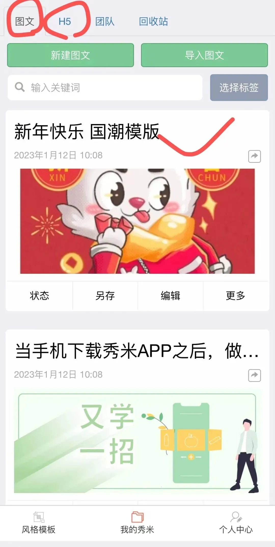 选购完成之后的风格模板,会被保存到“我的秀米”页面:风格排版保存在图文分类下;风格秀保存在H5分类下。