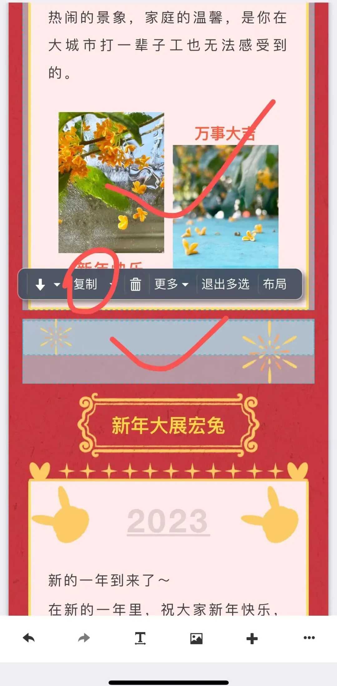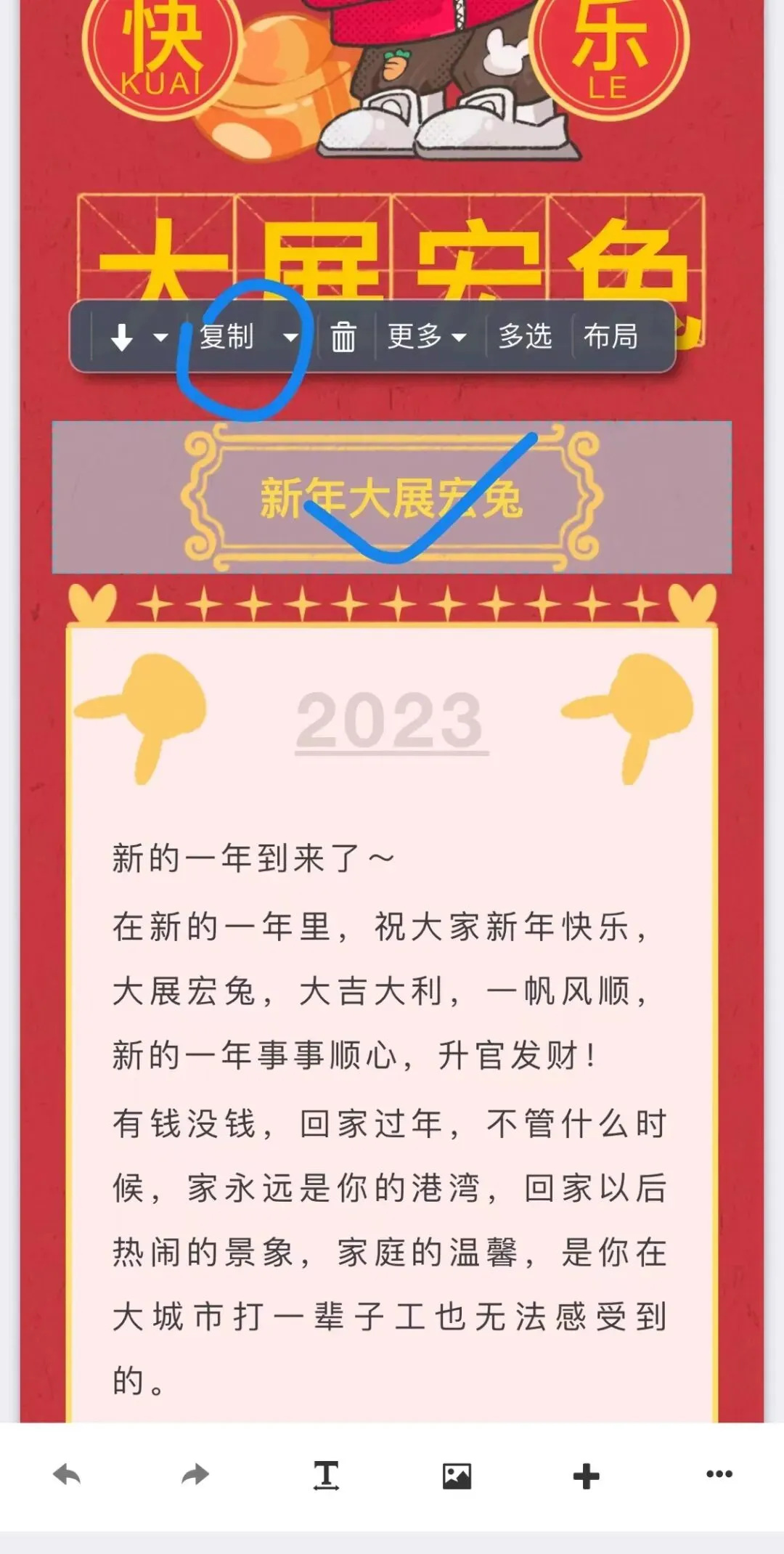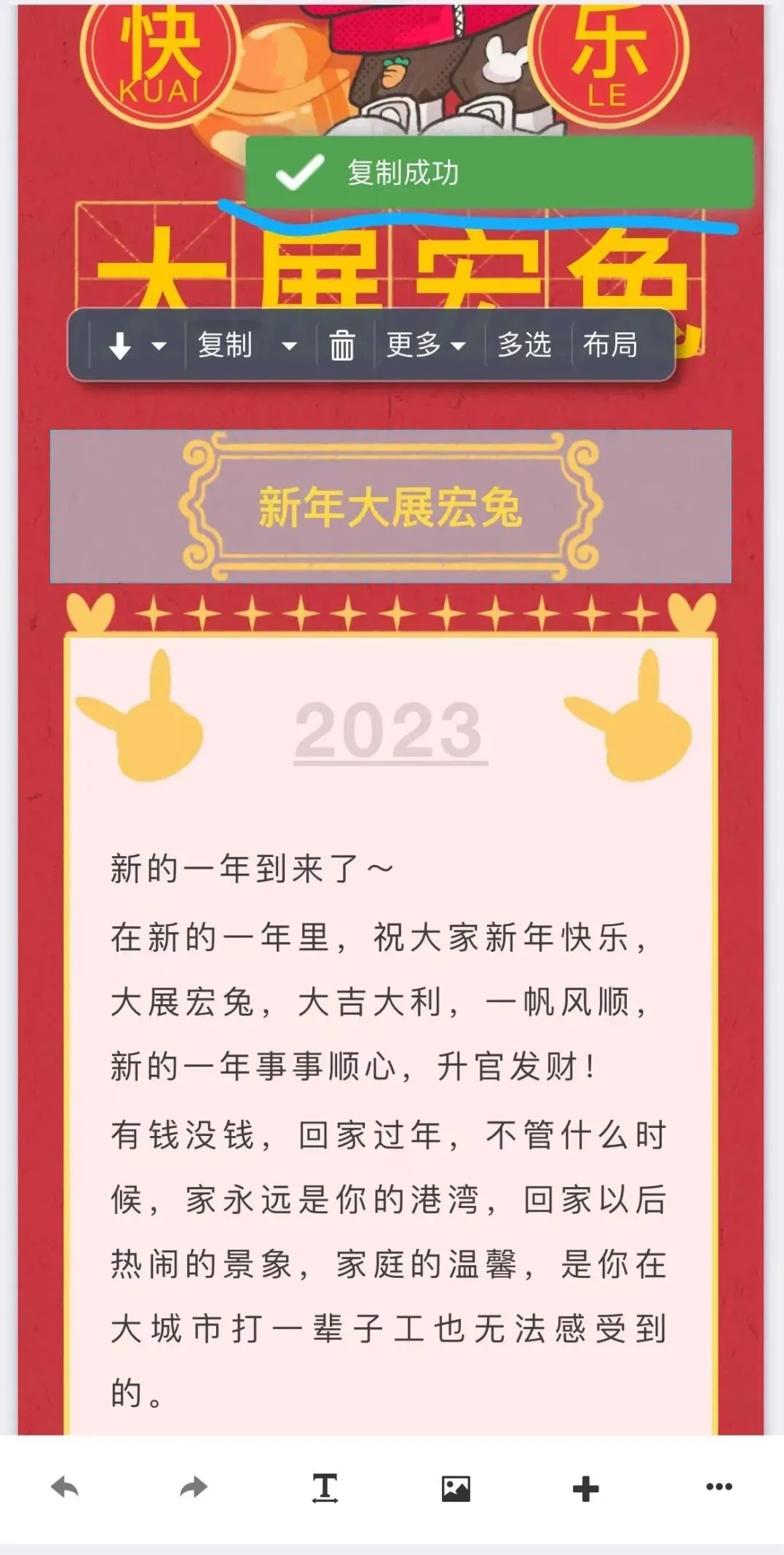 用手指点击单个组件选中,比如这个标题版式。然后点工具条上的“复制”,右上角会显示“复制成功”的提示: