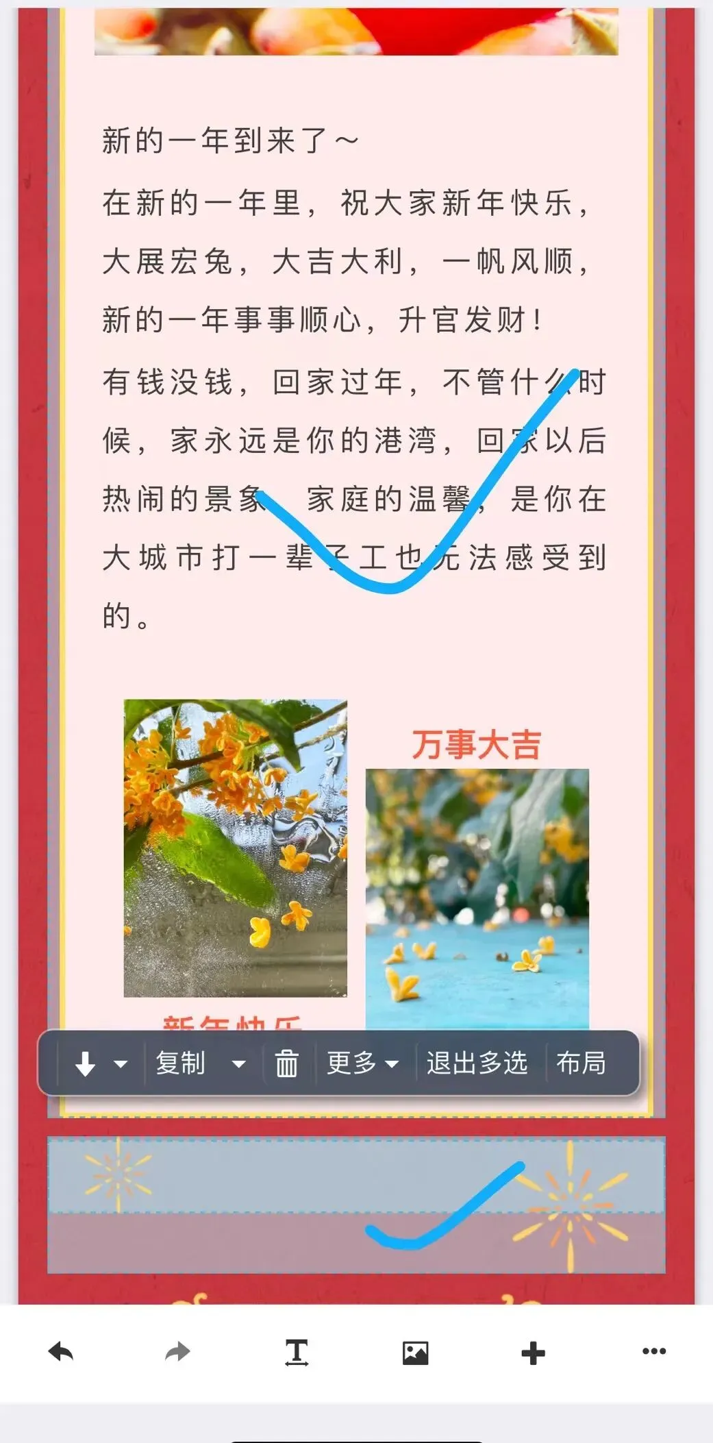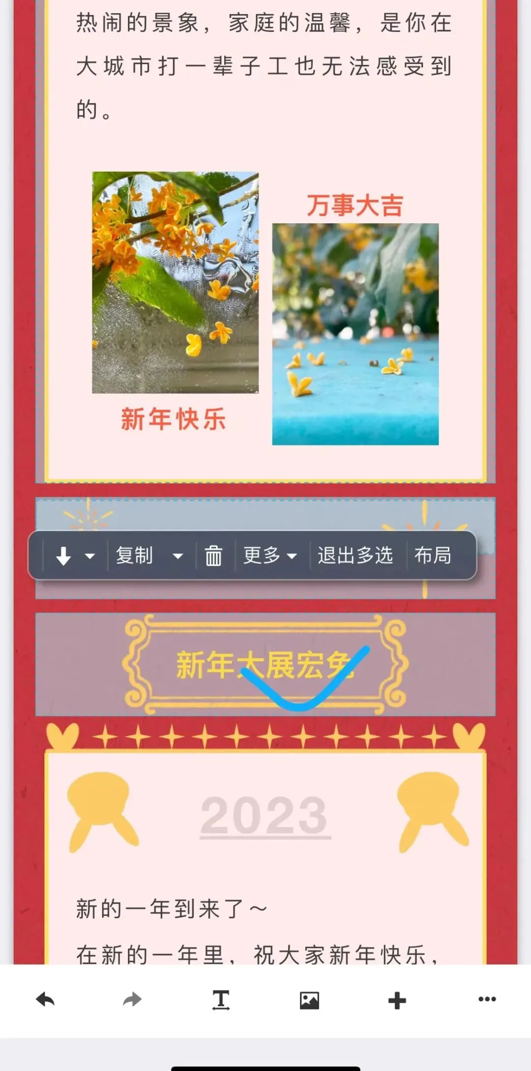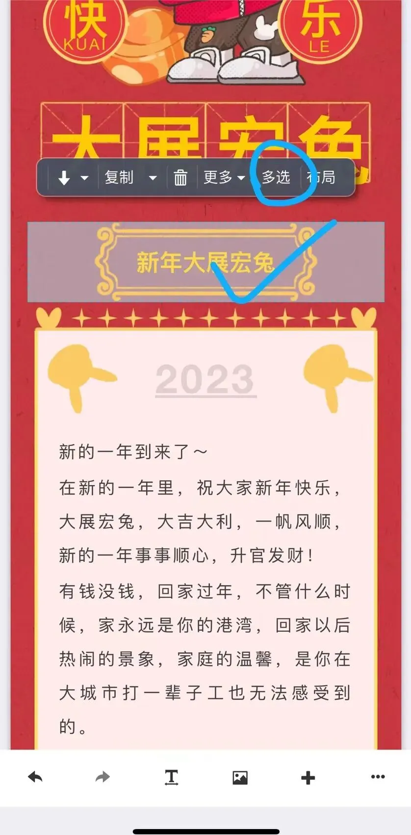 用手指点击单个组件选中,比如这个标题版式。然后点工具条上的“复制”,右上角会显示“复制成功”的提示: