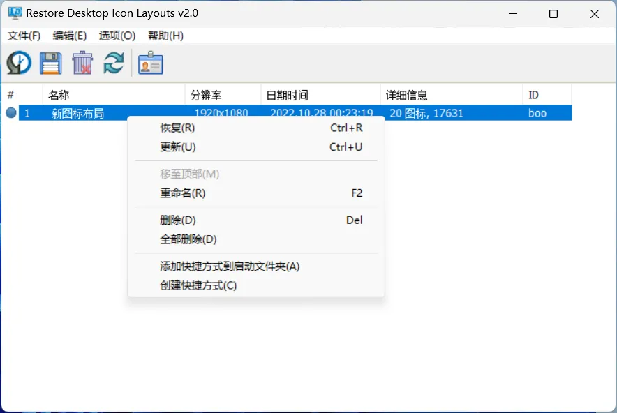既然开始菜单能够备份和恢复,那么桌面图标自然也少不了,ReIcon 的作用就是备份和恢复桌面图标位置。