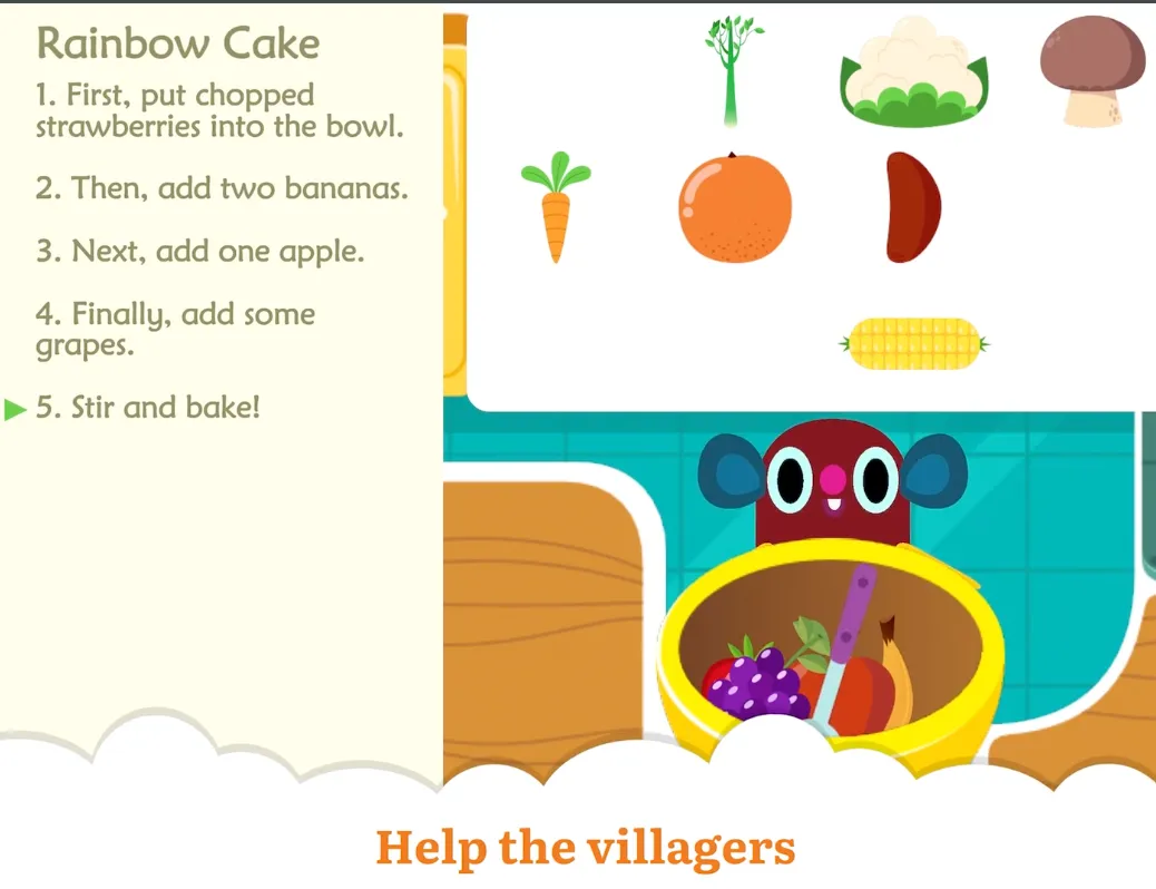 比如, 慕斯果汁店里(Moose Juice Store) ,一杯胡萝卜汁需要1个苹果和2根胡萝卜,小朋友通过数数和加减法,制作喜欢的沙冰和果汁!