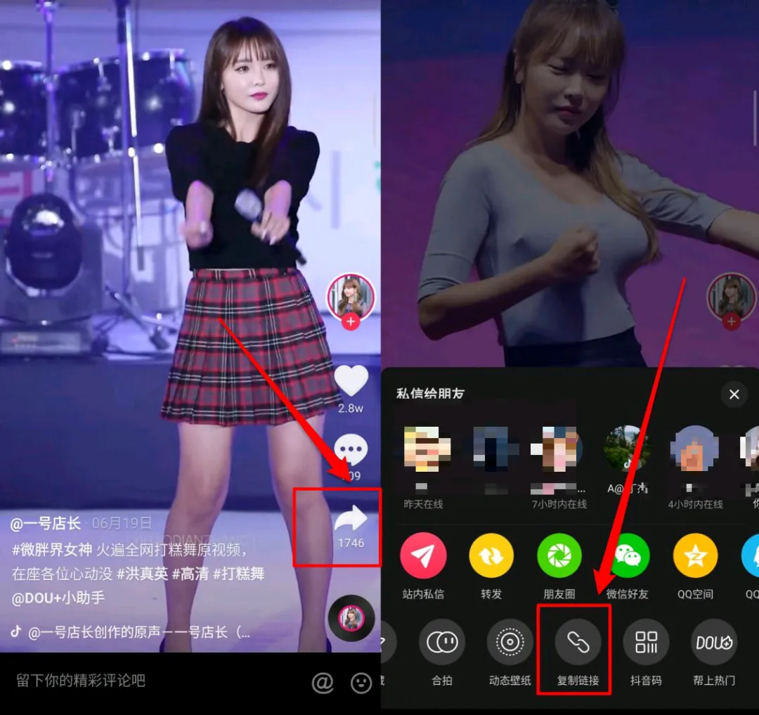 以Dou音APP,在喜欢的短视频页面点击“分享”按钮,然后找到“复制链接”的按钮点击复制视频链接。