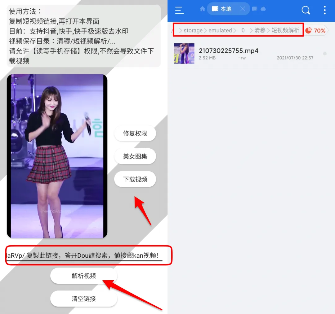 下载完成的视频文件就可以在手机相册内看的,如果看不到可以用文件管理器在储存空间的根目录/清穆/短视频解析,文件夹内可以找到!