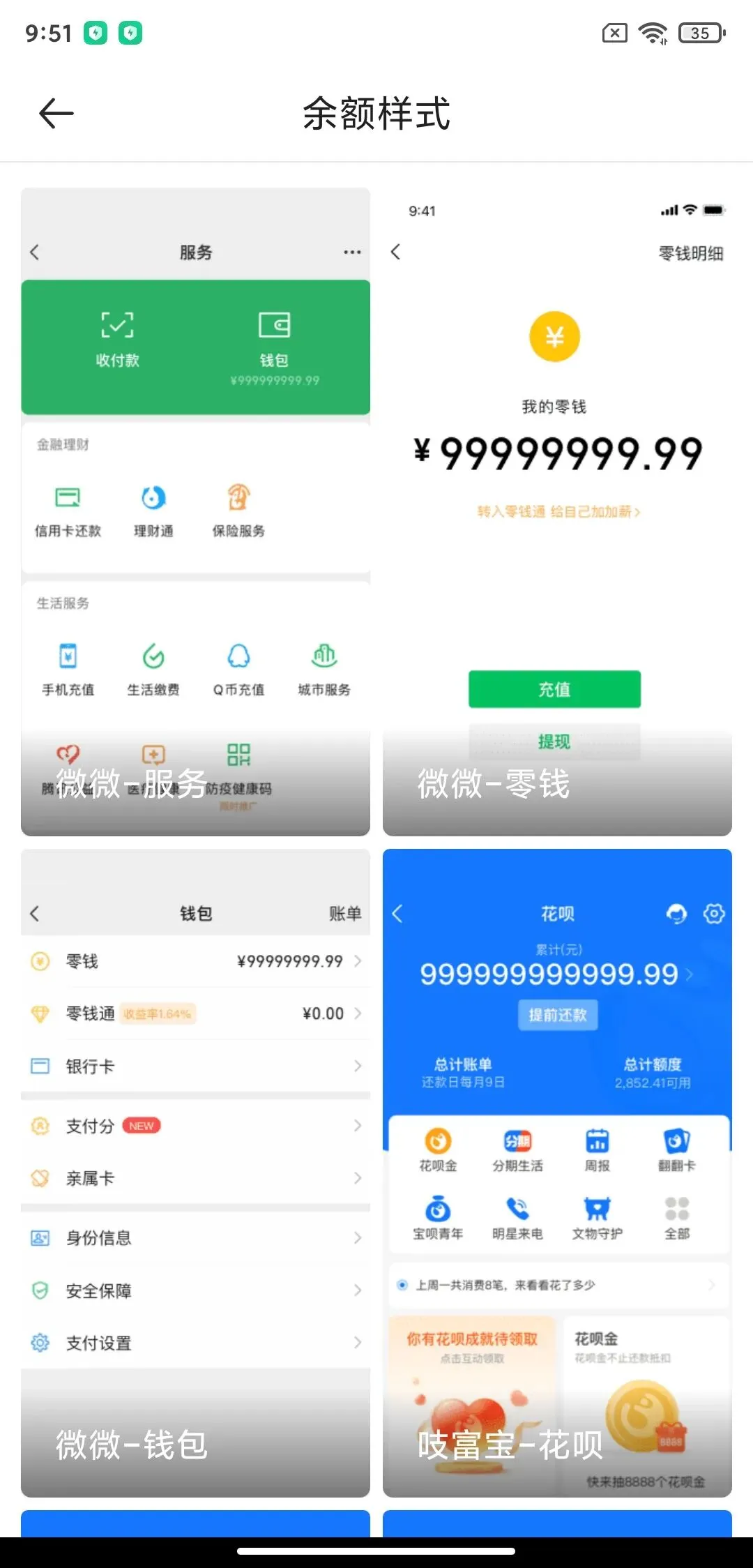 还有这个“模拟余额”,如果有人和你借钱,你不想借给他,但是2不好明说,你就可以玩笑几句,然后发一张余额截图给他,支持模拟微信余额、微信零钱、支付宝余额、花呗等好几个页面。