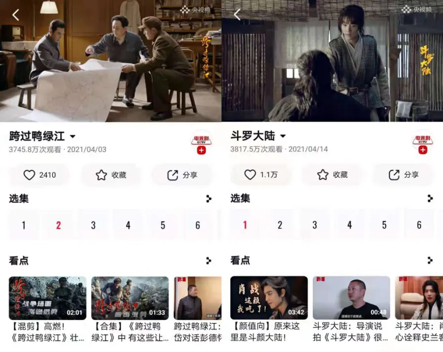 在拓展年轻化道路的同时,央视频还借助总台优质的资源优势,积累了覆盖各题材类型的经典影视作品。央视频建立了包括《建国大业》《铁道游击队》等影片在内的革命历史题材片单,以及包含《跨过鸭绿江》《我是特种兵》《亮剑》等剧集的军旅题材电视剧片单,继续扩大其在主旋律作品储备上的优势。