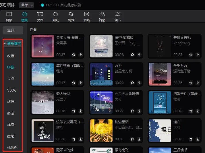 在短视频当道的今天,相信大家都有过拍视频、剪辑视频的念头!但,PR 太难不会用,会声会影限时特惠也要几百元……终于,我找到了抖音推出的剪映 Windows 版,免费无广告,全能易用,完美解决我的燃眉之急!它自带强大素材库,同步抖音千种热门素材,例如视频转场、片头片尾、高效配音片段等 👇热门音频按类型划分,剪辑更方便,还能同步抖音收藏!在抖音上刷到喜欢的 bgm 后,点击收藏,不用去其他地方下载导入,剪辑时就能直接用!除此之外经典高级特效、大片质感的滤镜、好玩有趣的花字,让我们的视频瞬间逼格满满!还有强大的 AI 智能字幕识别功能,可以自动识别视频中的语音、歌曲,并生成字幕。真的太省事了!效率工具篇提升效率,除了靠自制力,还可以利用一些小工具~