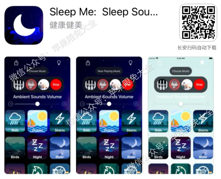 ● 简介:「Sleep Me」一款白噪音软件。选择软件中您喜欢的音乐即可伴你快速入眠