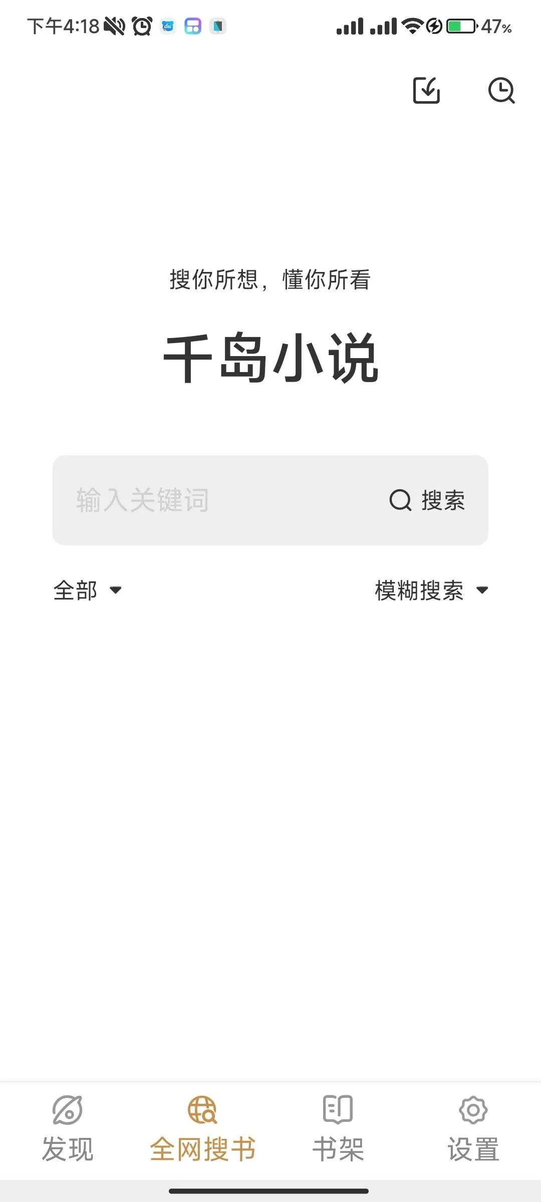 [文山书海,总有万千选择]开屏扑面而来的书香气质,纯白的背景,纯白的UI界面,一个简简单单的搜索框,搜索框左下角是书源的分类,右下角是精准搜索和模糊搜索的切换。