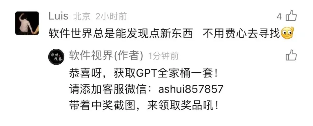 昨天中奖粉丝如下,小哥每天会在留言区抽选一位朋友赠送『GPT3.5+4.0永久授权码』一套,抽奖规则很简单,看留言内容随眼缘抽!恭喜下面这位朋友,请及时添加小哥好友领取!