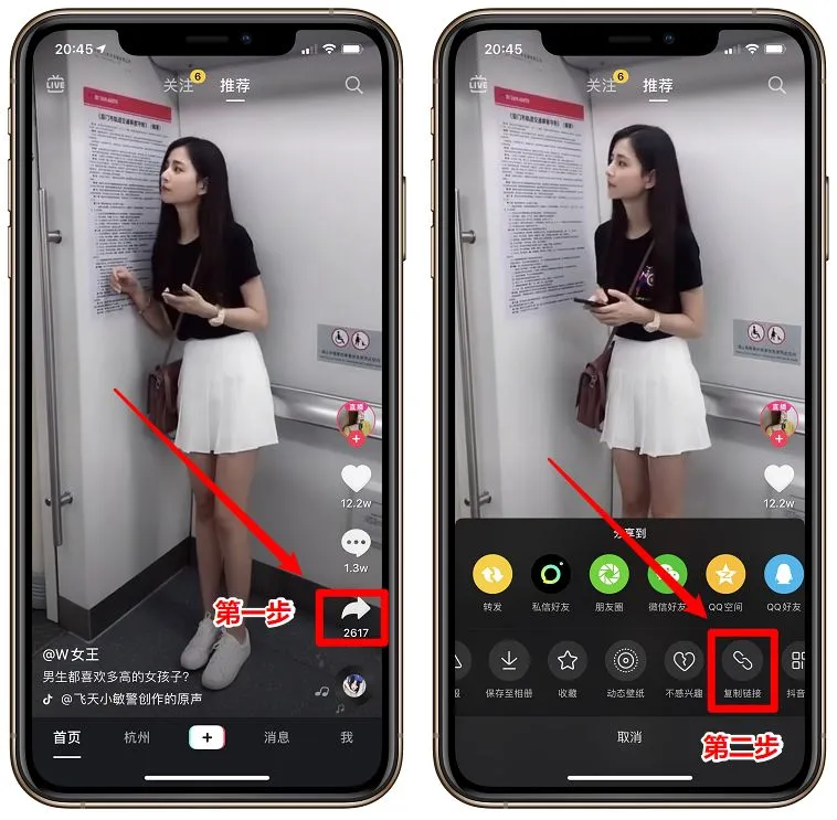 打开抖音,找一个你喜欢的小视频,选择【分享】【复制链接】。