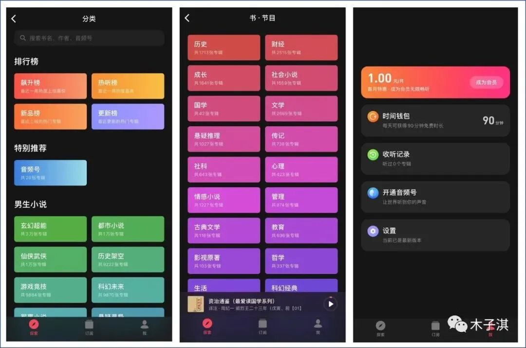 它支持的音频非常全面,包括:有声小说、书籍和播客等各类音频节目,你也可以在软件的分类版块发现很多高质量有声读物,包括:排行榜、特别推荐、男生小说、女生小说、书籍节目。