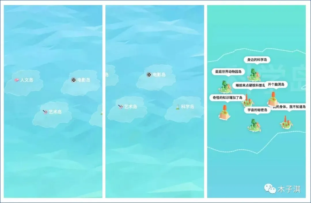 双指放大每个岛屿,你会发现每个岛屿还包括了很多岛屿,例如科学岛包括:身边的科学岛、开个脑洞岛、宇宙的秘密岛、奇怪的知识增加了岛、睡前来点硬核科普岛、逛逛世界动物园岛。