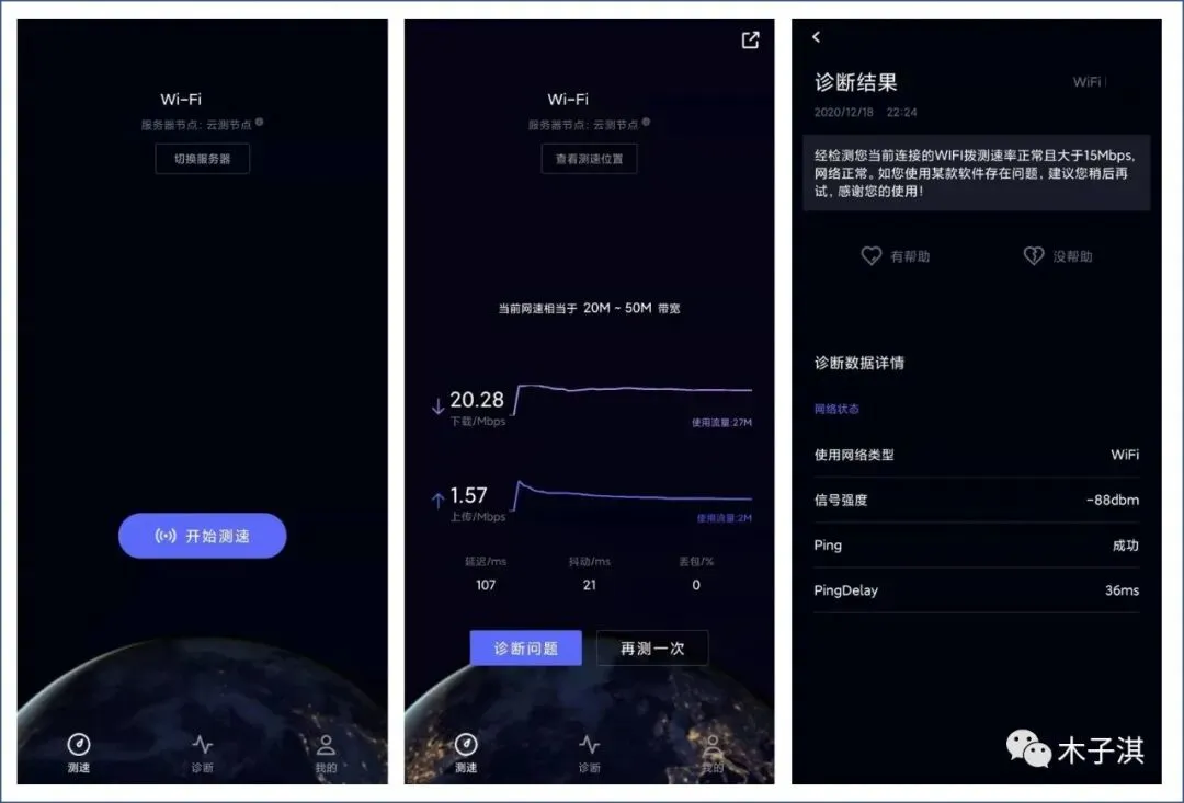 它支持测试网速功能,也支持网络诊断功能;其中测试网速功能支持多个数据准确清晰的呈现,包括:上传网速、下载网速、延迟等。