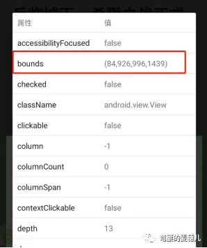 点击绿色方框,在弹出的窗口中,找到“查看控件信息”,在弹出的窗口中找到 bounds这个信息