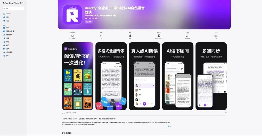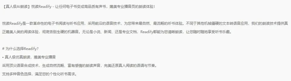 另一方面:正如其应用商店介绍:【真人级AI朗读】悦读Readify – 让任何电子书变成高品质有声书,媲美专业播音员的朗读体验!